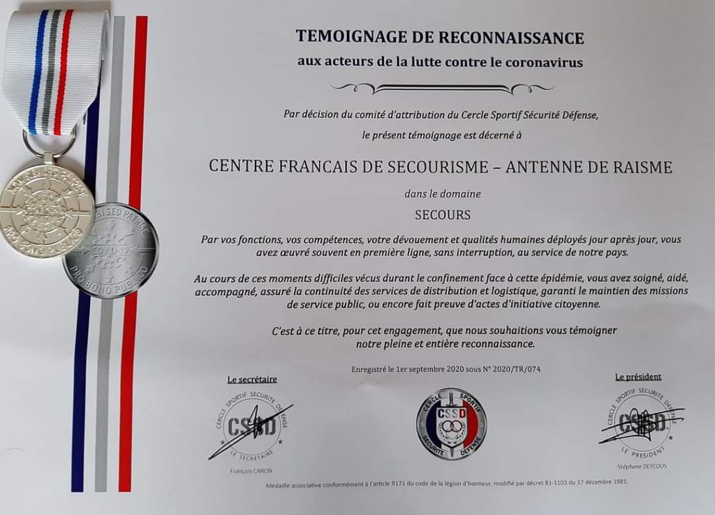 Un témoignage de reconnaissance aux acteurs de la lutte contre le coronavirus décerné à l’antenne de Raismes du Centre Français de Secourisme