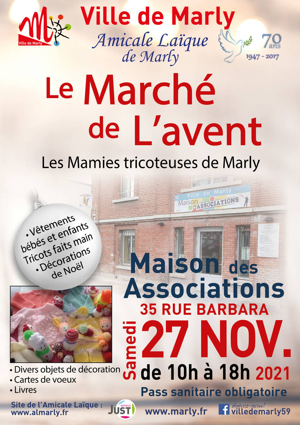 Le samedi 27 novembre de 10h à 18h à la Maison des Associations, l’Amicale Laïque de Marly propose son Marché de l’Avent avec la participation de l’Atelier des Mamies Tricoteuses.