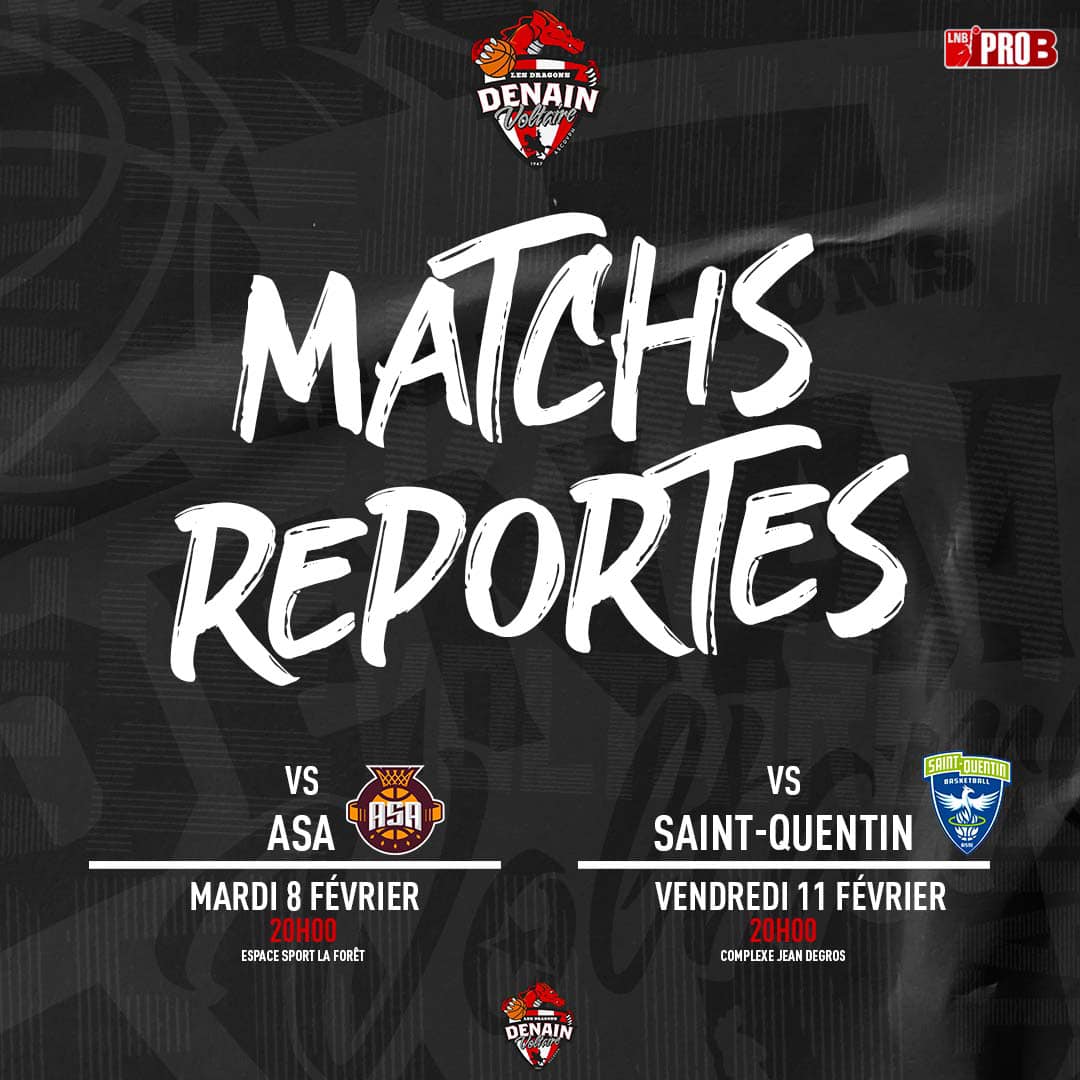 Le match de demain soir (mardi 8 février) en Alsace est donc reporté à une date ultérieure, ainsi que le derby face au Saint Quentin Basket Ball (vendredi 11 février).
