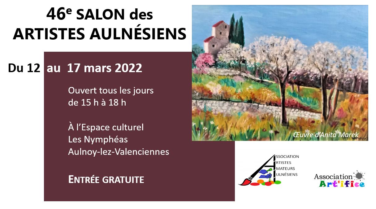 L’association des artistes amateurs aulnésiens organise du 12/03 au 17/03 son exposition annuelle à l’espace culturel Les Nymphéas à Aulnoy lez Valenciennes.