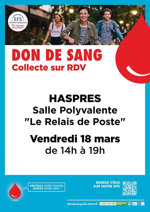 Tous à vos Agendas ! Vous êtes cordialement invités à la collecte du Don De Sang sur la commune d’Haspres.