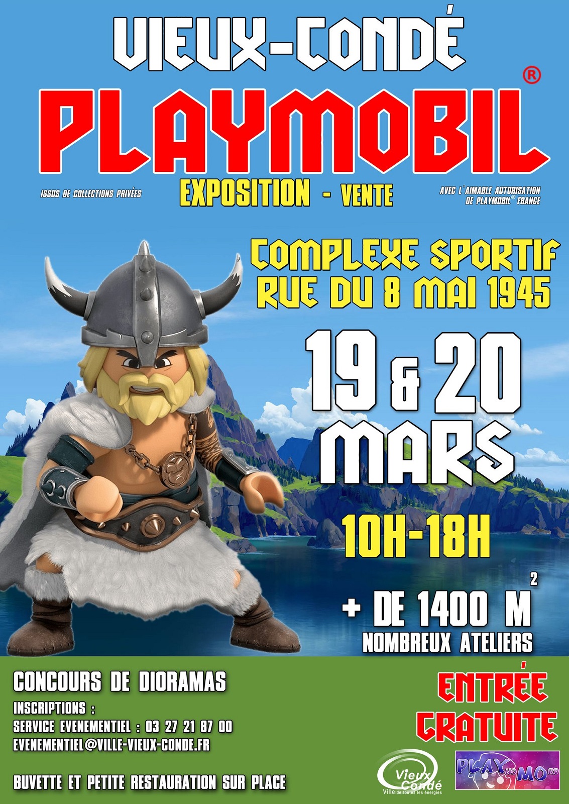 Les 19 et 20 mars, le plus grand évènement ludique de l’année à Vieux‐Condé sera gratuit ! Plus de 1 400 m² d’expositions, 25 dioramas (de 2m² à 36m²), 25 exposants, de nombreux ateliers participatifs… Quand les Playmobils débarquent à Vieux‐Condé, ils ne font pas les choses à moitié.