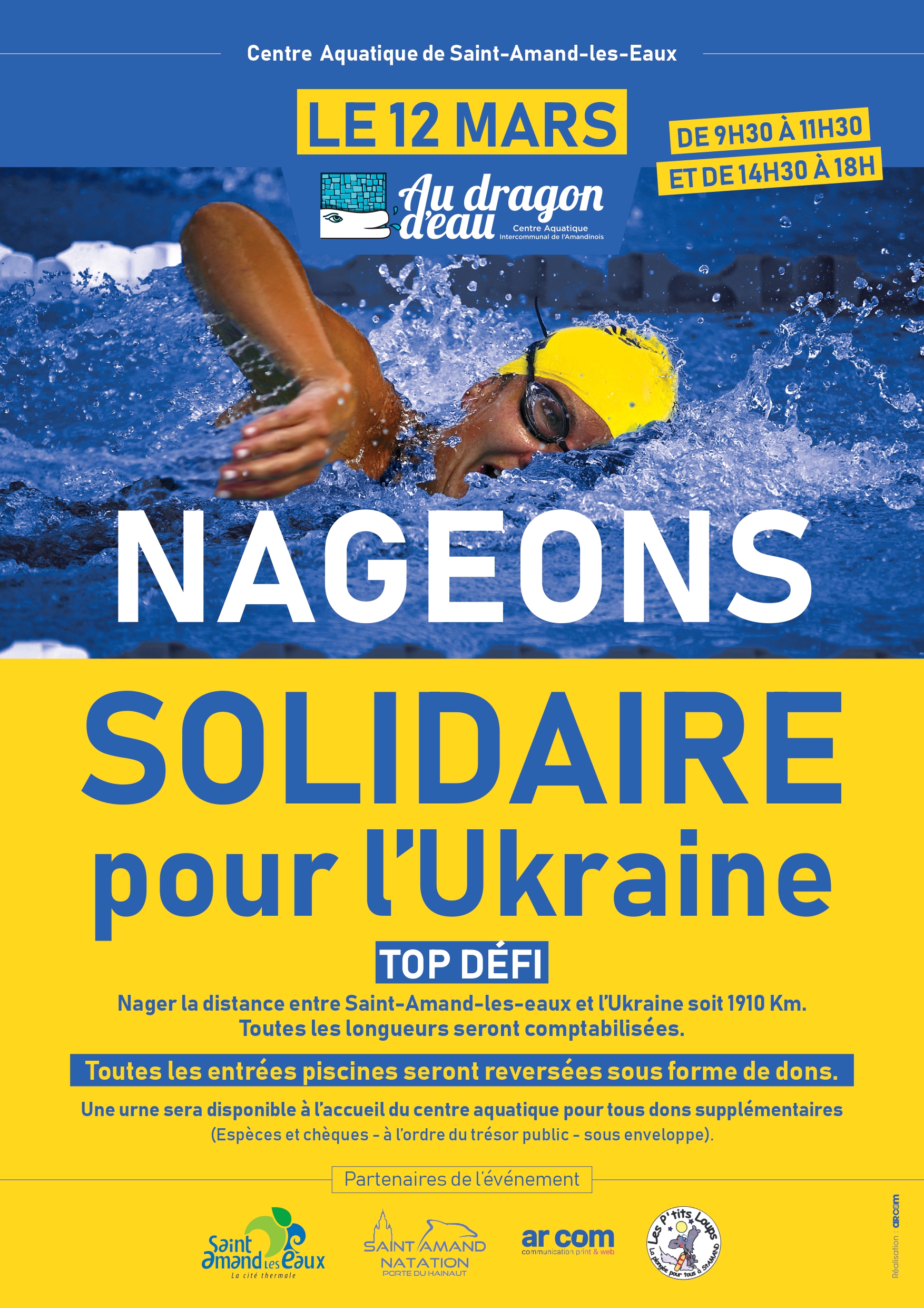 Le Dragon D’eau et ses partenaires organisent un top défi pour l’Ukraine, et qui a pour objectif de nager les 1910 km qui séparent Kiev de Saint-Amand-les-Eaux ce samedi 12 mars.