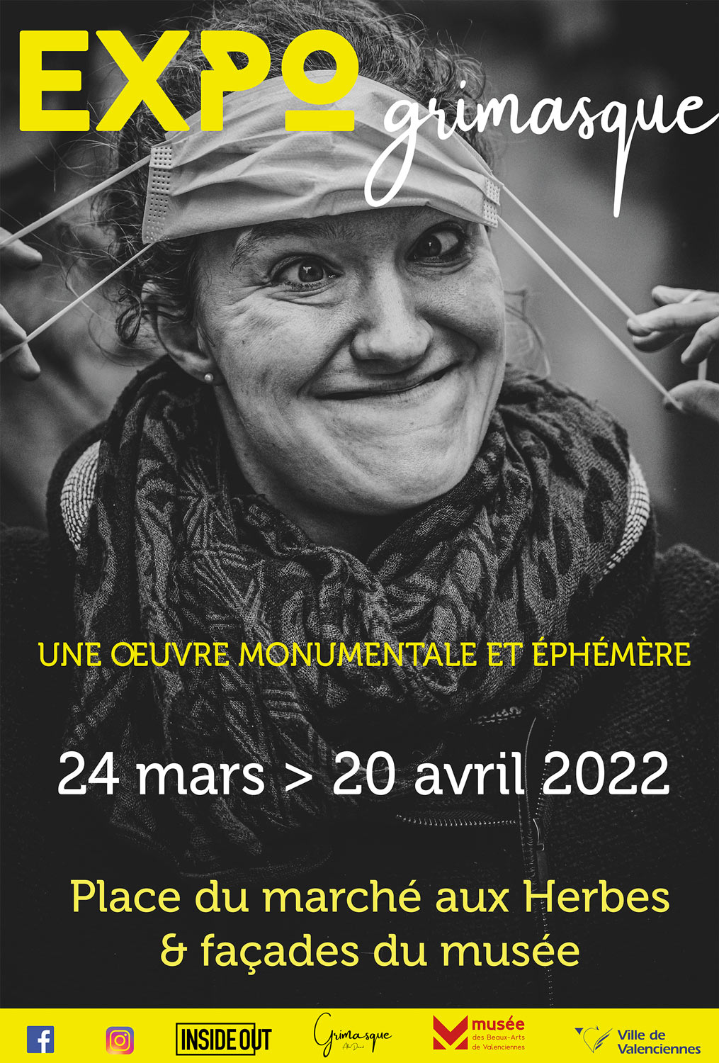En 1 an, le projet grimasque s’est étendu aux hôpitaux, aux écoles, aux entreprises et même aux collectivités. Près de 2500 portraits plus tard, « Grimasque » s’associe avec le Musée des Beaux-Arts de Valenciennes et Inside Out Project, fondée par l’artiste JR et qui promeut l’art urbain en aidant des communautés à se rassembler autour d’un projet, pour créer une œuvre monumentale et éphémère, exposant plus de 1500 portraits géants sur la Place du Marché aux Herbes ainsi que deux façades du Musée de Valenciennes durant tout le mois d’Avril 2022.