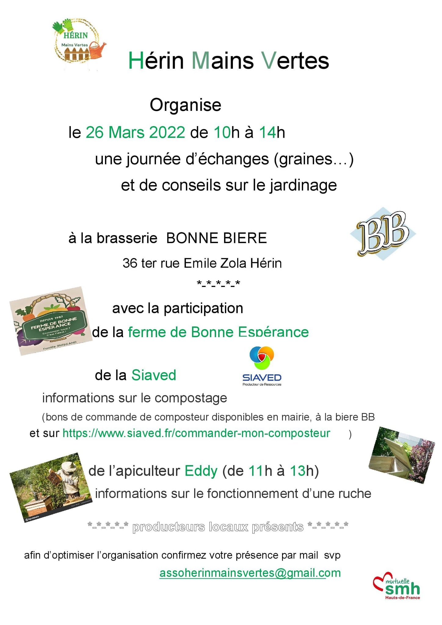 La toute jeune association Hérin Mains Vertes créée le 27 mars 2021, en partenariat avec la ferme de Bonne Espérance et de la mutuelle SMH, va organiser des journées de troc, échange de semences, de plantes, de graines et de boutures selon la saison.