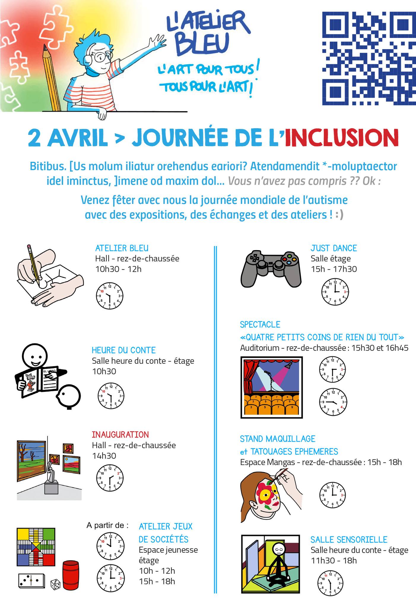 Le samedi 2 avril, l’Atelier bleu vous invite à la médiathèque d’Anzin pour une journée d’animations adaptées ouvertes à tous :