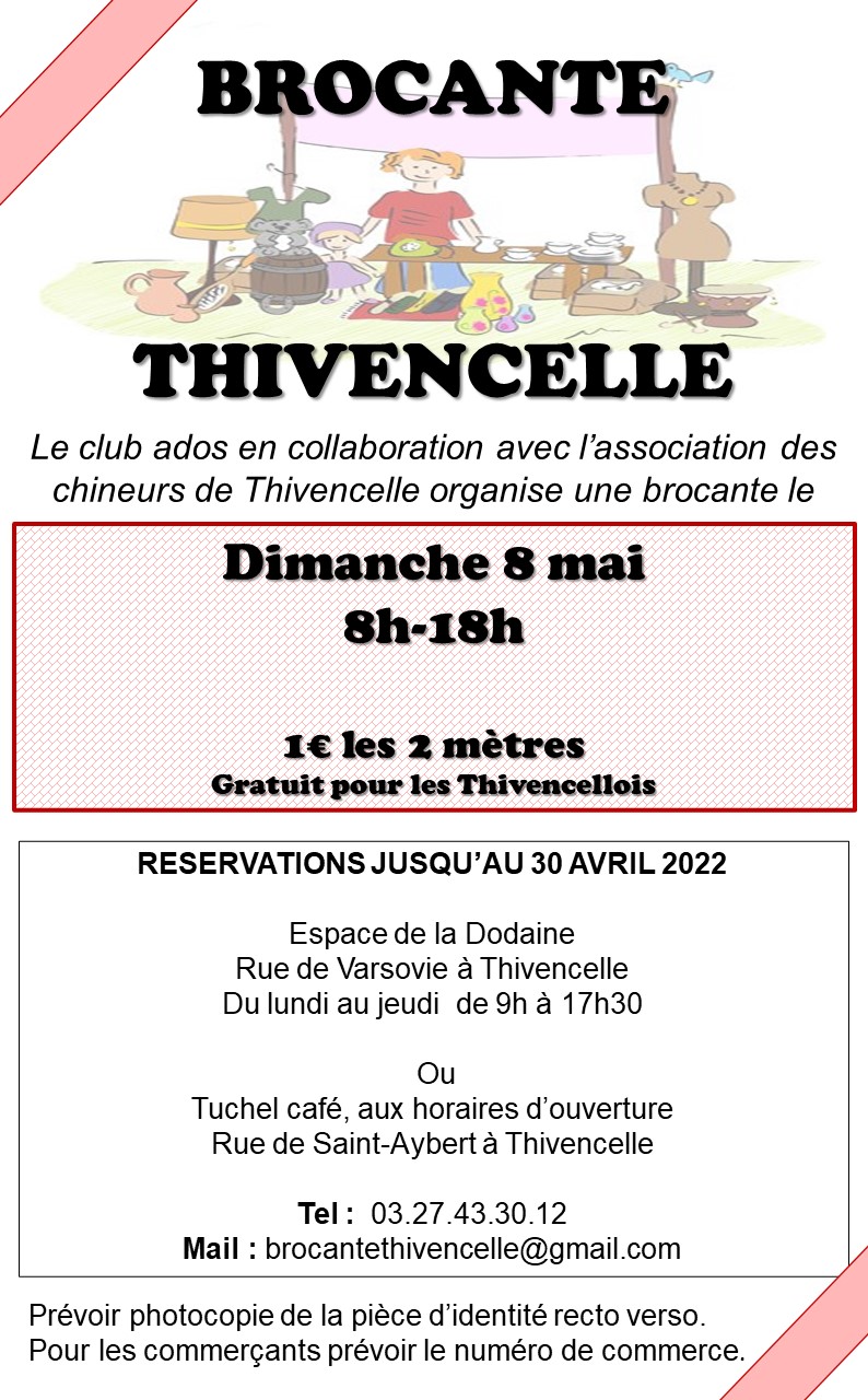 Le club ado en collaboration avec l’association des chineurs de Thivencelle organise la brocante annuelle de Thivencelle le 8 mai 2022.