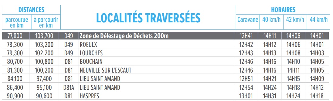 Les villes traversées par les coureurs des 18 équipes engagées sont : Roeulx, Lourches, Bouchain, Neuville sur l’Escaut, Lieu Saint-Amand, et Haspres.