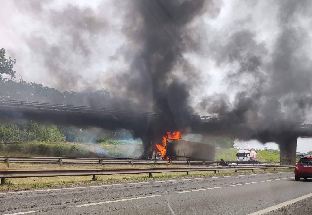 Avec le choc, le poids lourd a pris feu, endommageant et la pile et le pont.