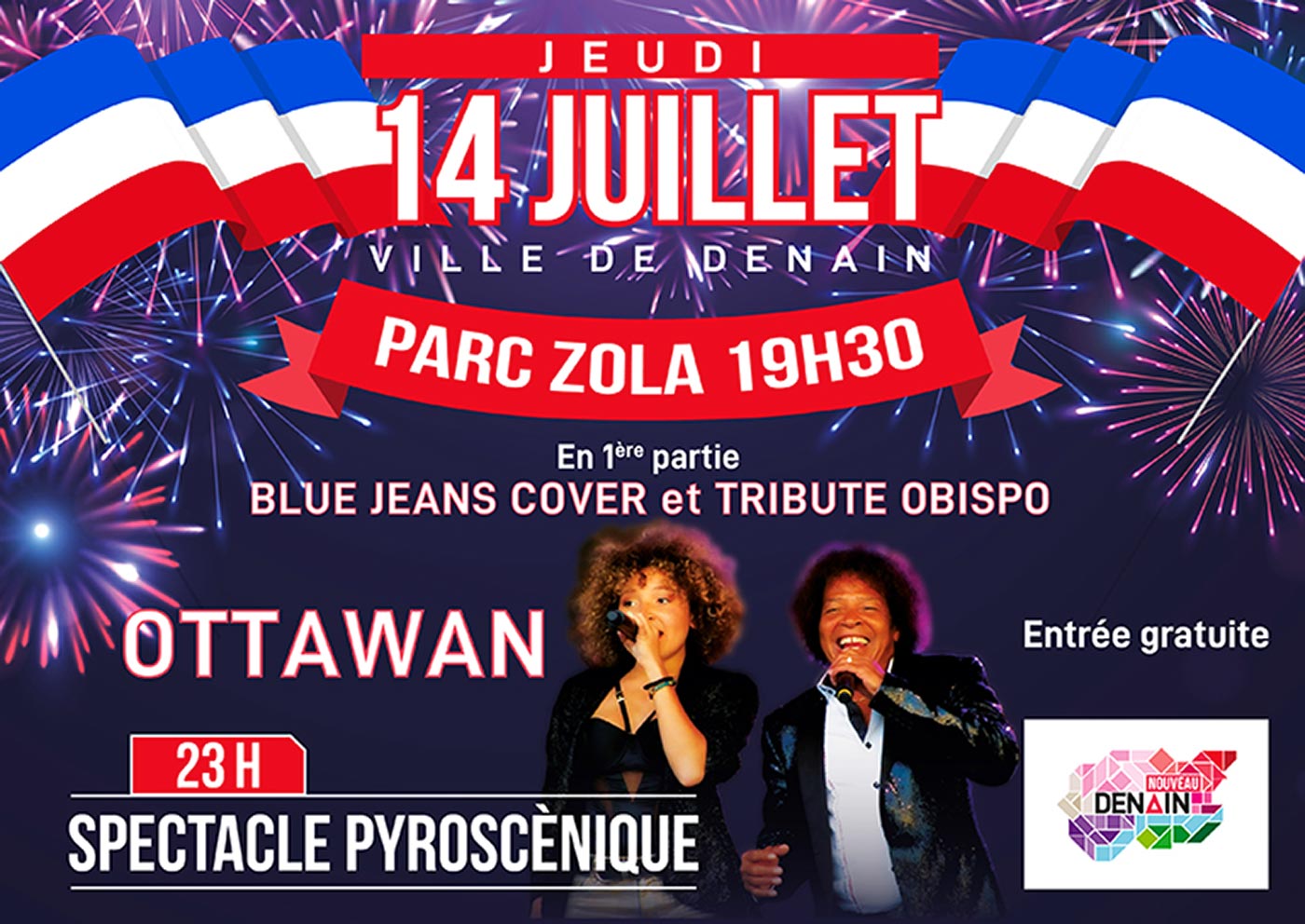 Les festivités débuteront à 19h30 avec la formation « Blue Jeans Cover » qui reprendra un large répertoire national et international sur la scène du parc Emile Zola.