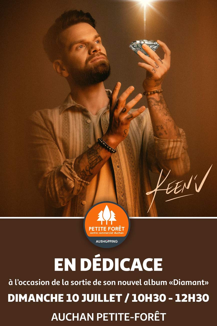 Keen’V sera à Auchan Petite-Forêt pour une séance de dédicace le dimanche 10 juillet de 10h30 à 12h30 à l’occasion de la sortie de son nouvel album « Diamant ».