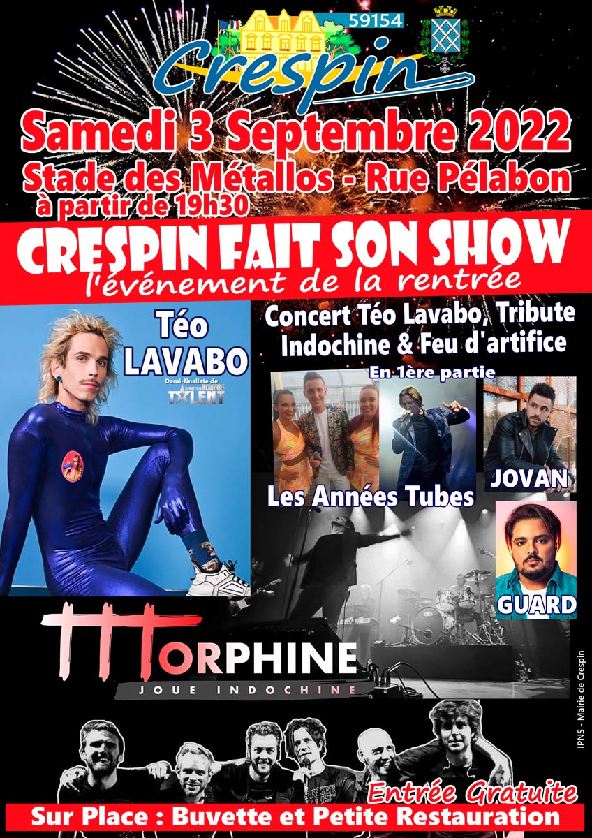 Les samedi 3 septembre 2022 à partir de 19h30, « Crespin fait son show » avec un concert de Téo Lavabo (Demi finaliste de la France a un Incroyable Talent qui totalise plus de 40 Millions de vues sur youtube pour son tube Chipolata ) et du groupe Tribute « Indochine » Morphine qui reprendront les tubes du groupe culte du rock français.