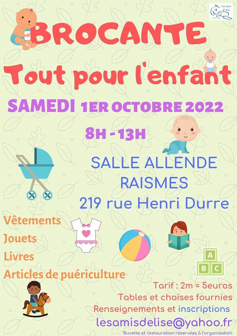 L’association Les Amis d’Elise organise sa traditionnelle brocante « Tout pour l’Enfant » le samedi 1er octobre de 8h à 13h. Elle se déroulera à la salle Allende, 219 rue Henri Durre à Raismes.