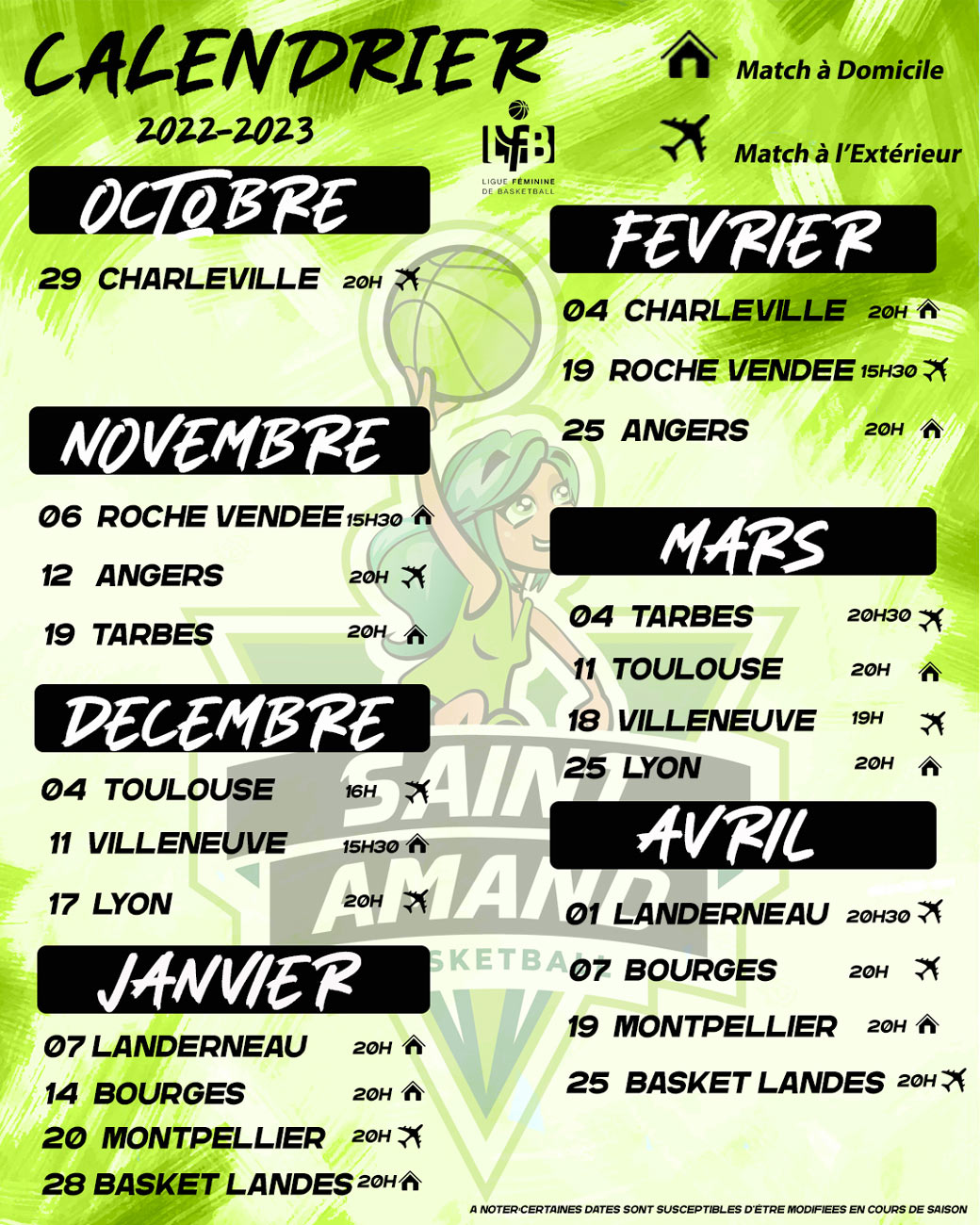 Que la saison à domicile débutera le 6 Novembre contre La Roche Vendée et que les Green Girls iront clôturer l’exercice 2022/2023 à Basket Landes avant d’entamer d’éventuels PlayOffs ou PlayDowns.