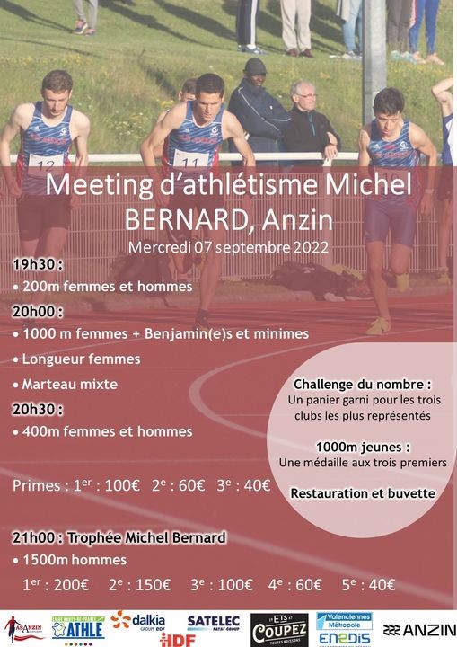 Le mercredi 7 septembre à partir de 19h30, l’AS Anzinoise Athlétisme organise, en partenariat avec la ville, son meeting d’athlétisme Michel Bernard au complexe sportif Michel Bernard.