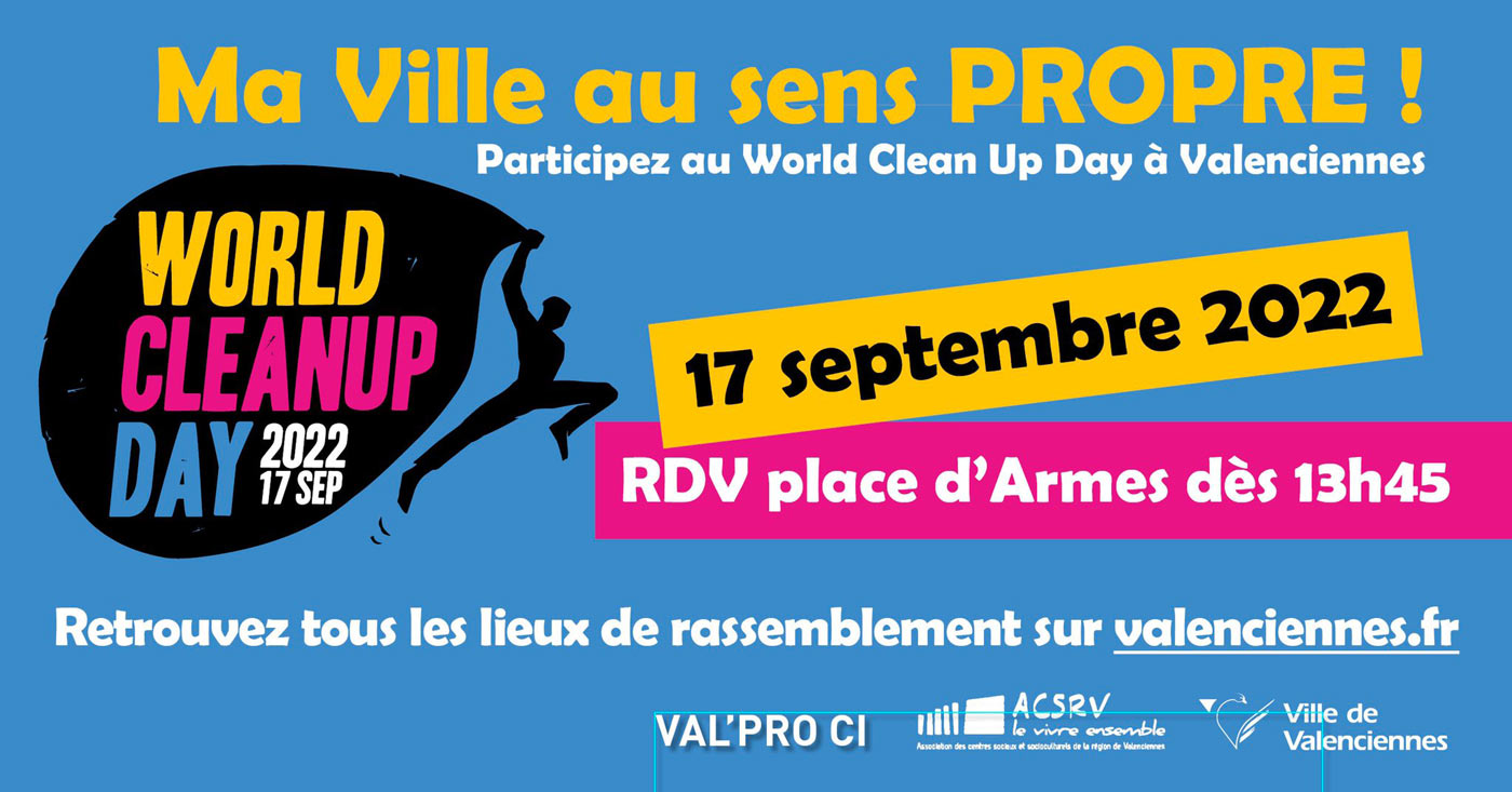 La Ville de Valenciennes, l’association Val Pro Ci et les maisons de quartier s’associent à la journée mondiale du nettoyage de notre planète. Au-delà du ramassage de déchets, le but de la World Clean Up Day est de changer les comportements et d’éveiller les consciences à des concepts écologiques comme le « mieux produire », le « mieux consommer » ou encore le « mieux et moins jeter ».