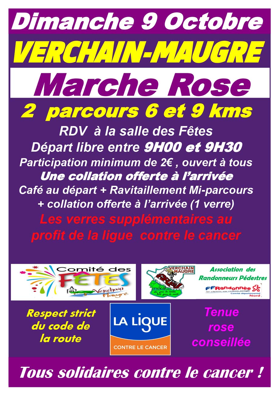Après une première édition en 2021 ayant réunie près de 400 personnes, le Comité des Fêtes de Verchain-Maugré et Les Randonneurs Pédestres Verchinois ARPV organisent en collaboration une Marche Rose, le 9 octobre 2022 :