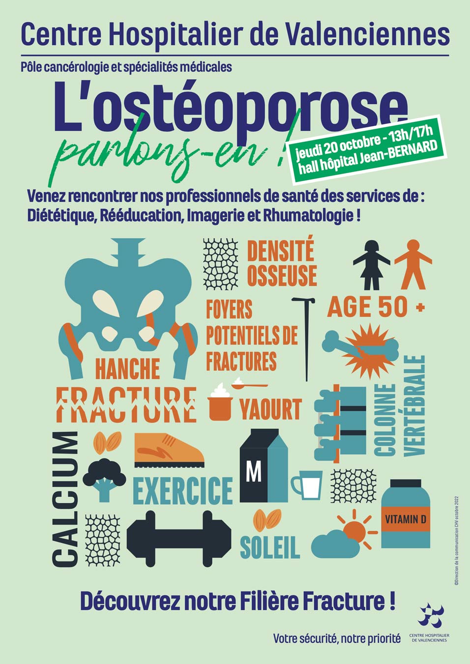 Les professionnels de santé du Centre hospitalier de Valenciennes organisent, en écho à la journée mondiale dédiée à l’ostéoporose, une après-midi d’information et de prévention : le jeudi 20 octobre de 13h à 17h dans le hall Jean-Bernard. Des stands de sensibilisation et la visite d’un examen de densitométrie osseuse seront proposés.