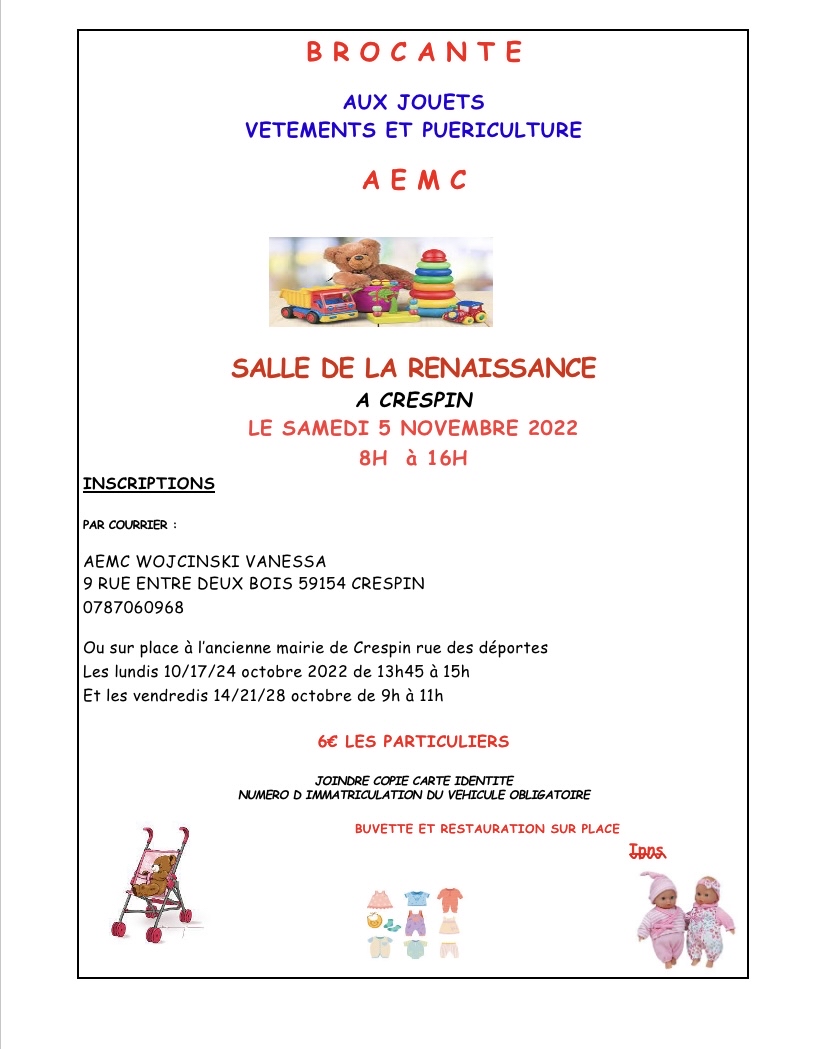 L’association de l’école maternelle de Crespin organise le 5 novembre une brocante aux jouets, vêtements et puériculture.