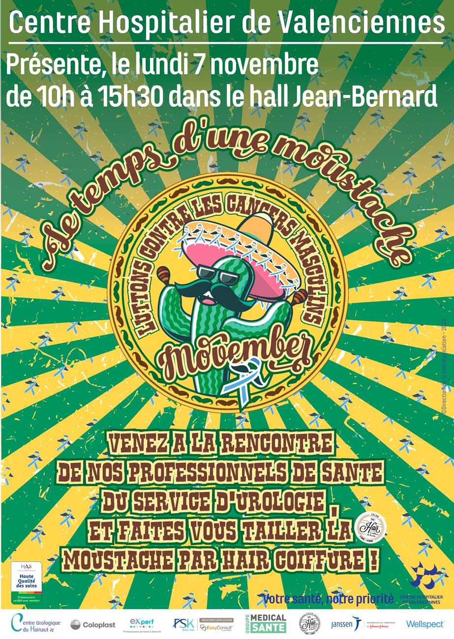 Chaque année, de nombreux hommes sont touchés par les différents cancers masculins. En France, le cancer de la prostate provoque 9.000 décès par an. Le taux de mortalité diminue depuis de nombreuses années grâce à l’amélioration des traitements et aux campagnes de sensibilisation, de plus en plus nombreuses, menées durant Movember (ou Novembre, mois de lutte contre les cancers masculins). A cette occasion, le Centre Hospitalier de Valenciennes se mobilise et propose plusieurs actions sur le thème Mexicain.