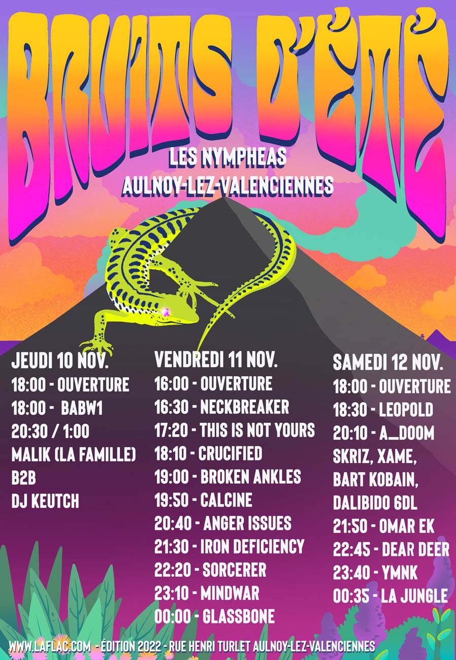 Vendredi 11 novembre (métal hardcore en collaboration avec Taste of Mind) 16h – 1h Glassbone, Sorcerer, Calcine, Anger Issues, Jaw Crack, Iron Deficiency, Neckbreaker, Broken Ankles, This is not yours, Mindwar.