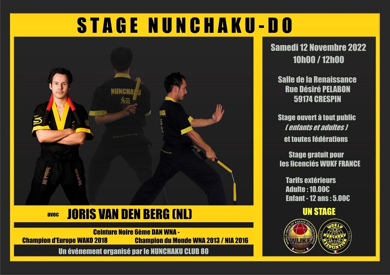 Le Club « Hainaut Shotokan Karaté et Krav Maga Crespin », présidé par Frédéric MOTHY et le club de Nunchaku de Christophe Koza (4ème DAN) et Michel DELCOURT (6ème DAN de GOSHINDO et Président de la ligue WUKF France des Hauts-de-France et du Grand-Est) et leurs comités organisent un stage de « Nunchaku », et accueilleront Joris Van Den Berg (6ème DAN), Champion d’Europe et du Monde de Nunchaku.