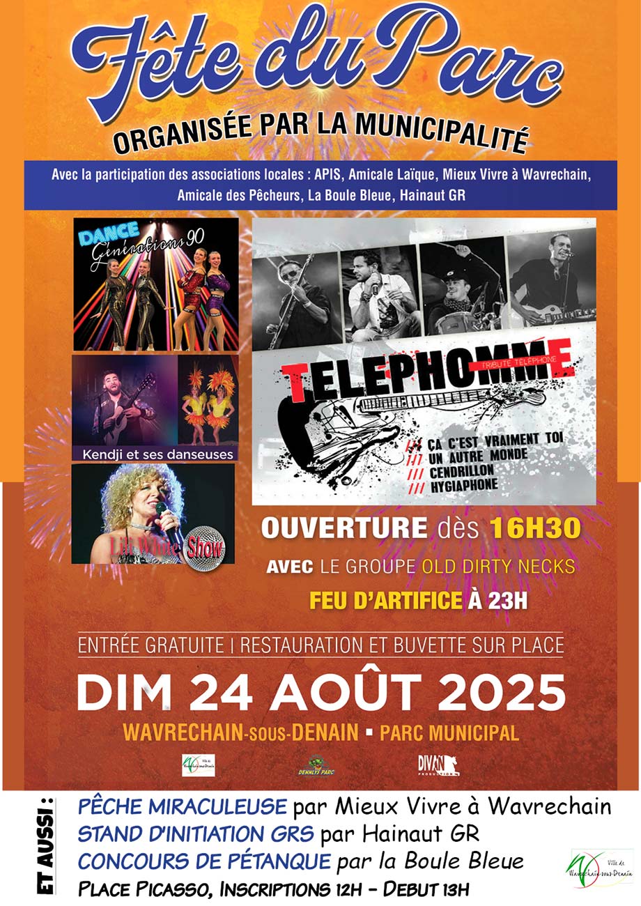 Avec le soutien actif des associations locales telles que APIS, l’Amicale Laïque, Mieux Vivre à Wavrechain, l’Amicale des Pêcheurs, La Boule Bleue et Hainaut GR, cette journée promet d’être placée sous le signe de la convivialité. L’ouverture des festivités est prévue dès 16h30 au parc municipal. Le groupe Old Dirty Necks donnera le coup d’envoi de la scène musicale, suivi de nombreuses performances dont Dance Générations 90, Kendji (sosie) et ses danseuses, le Lili White Show et, en tête d’affiche, le groupe Telephomme, hommage vibrant au célèbre groupe Téléphone.