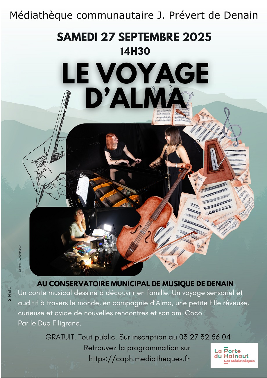 La Médiathèque communautaire Jacques Prévert de Denain propose un rendez-vous culturel à ne pas manquer le samedi 27 septembre 2025 à 14h30 au Conservatoire municipal de musique de Denain. Le public est invité à découvrir « Le Voyage d’Alma », un conte musical dessiné pensé pour toute la famille.