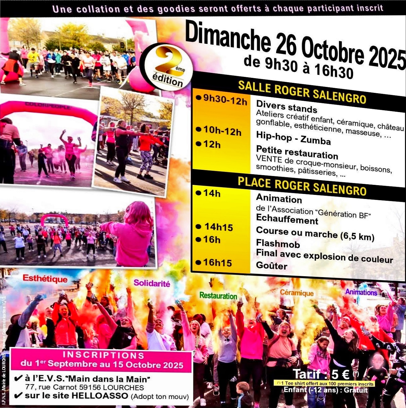 L’après-midi sur la place Roger Salengro s’annonce particulièrement festif. Dès 14h, l’association « Génération BF » proposera un échauffement avant une course ou marche de 6,5 kilomètres à 14h15. À 16h, un flashmob surprendra les passants, suivi à 16h15 d’une explosion finale de couleur marquant l’apothéose de la journée. Un goûter clôturera cette manifestation.