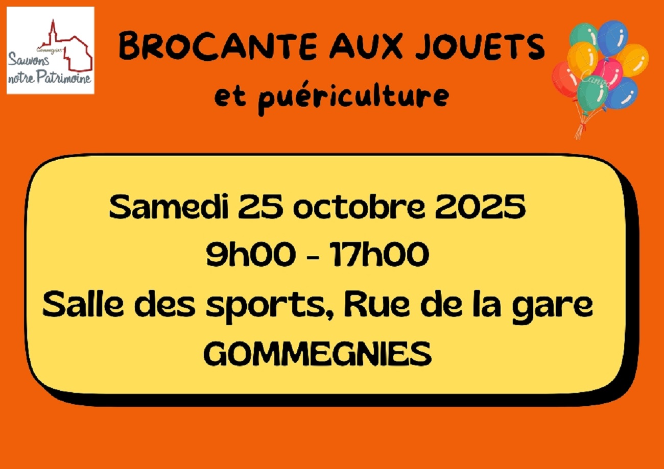 L’association « Sauvons notre Patrimoine » organise une grande brocante aux jouets, matériel de puériculture et vêtements pour enfants le samedi 25 octobre 2025, de 9h00 à 17h00, à la salle des sports, rue de la gare à Gommegnies.