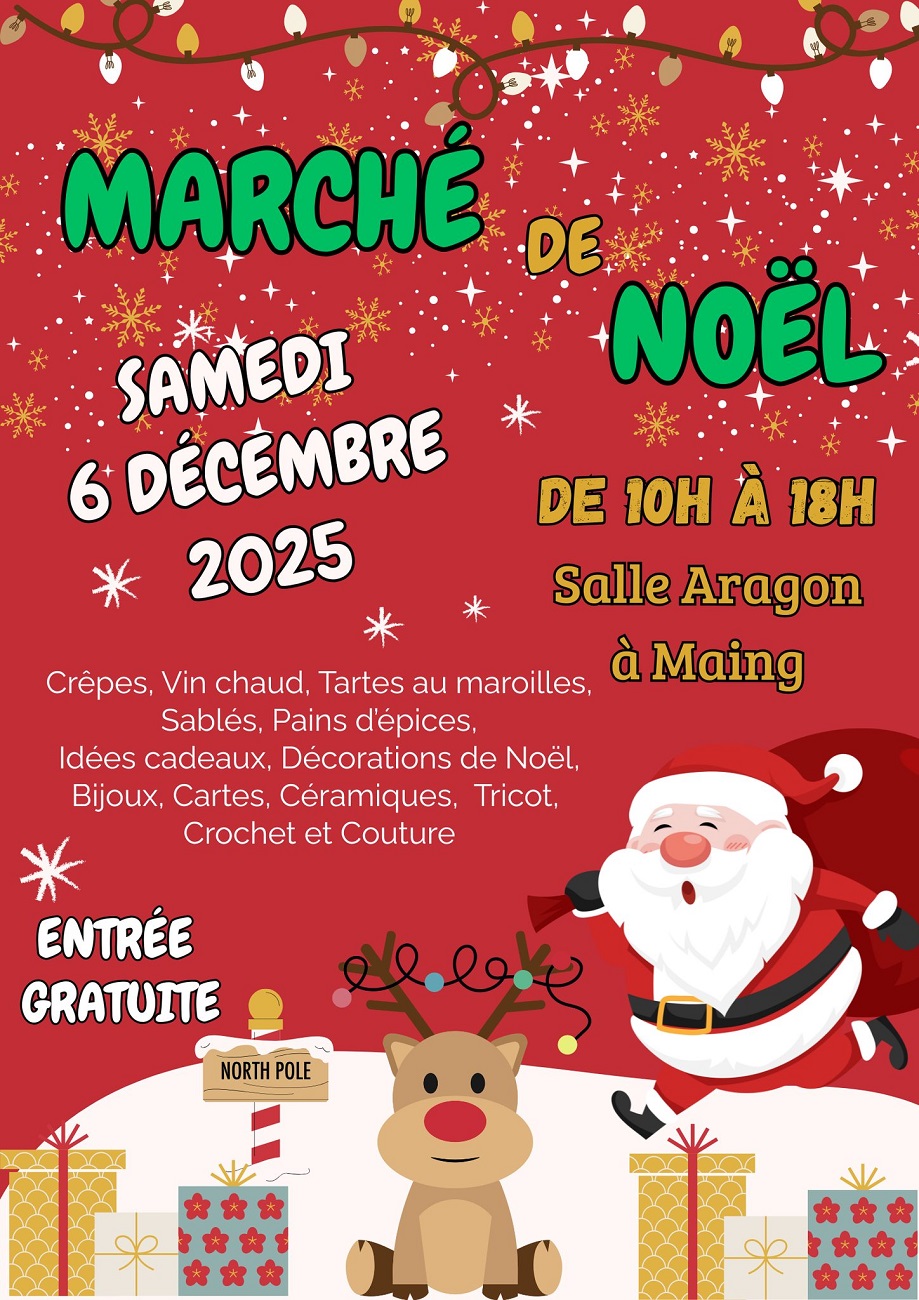 La commune de Maing organise son marché de Noël le samedi 6 décembre 2025, de 10h à 18h, à la salle Aragon. Cette manifestation, dont l’entrée est gratuite, promet de plonger petits et grands dans la magie des fêtes de fin d’année.